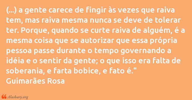 (...) a gente carece de fingir às vezes que raiva tem, mas raiva mesma nunca se deve de tolerar ter. Porque, quando se curte raiva de alguém, é a mesma coisa que se autorizar que essa própria pessoa passe durante o tempo governando a idéia e o sentir da gente; o que isso era falta de soberania, e farta bobice, e fato é."