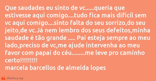 Que saudades eu sinto de vc......queria que estivesse aqui comigo....tudo fica mais dificíl sem vc aqui comigo....sinto falta do seu sorrizo,do seu jeito,de vc.Já nem lembro dos seus defeitos,minha saudade é tão grande ..... Pai esteja sempre ao meu lado,preciso de vc,me ajude intervenha ao meu favor com papai do céu.........me leve pro caminho certo!!!!!!!!!