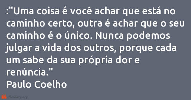 :"Uma coisa é você achar que está no caminho certo, outra é achar que o seu caminho é o único. Nunca podemos julgar a vida dos outros, porque cada um sabe da sua própria dor e renúncia." Paulo Coelho