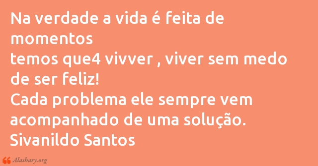 Na verdade a vida é feita de momentos temos que4 vivver , viver sem medo de ser feliz! Cada problema ele sempre vem acompanhado de uma solução. Sivanildo Santos