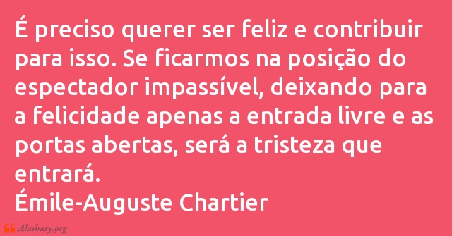 É preciso querer ser feliz e contribuir para isso. Se ficarmos na posição do espectador impassível, deixando para a felicidade apenas a entrada livre e as portas abertas, será a tristeza que entrará. Émile-Auguste Chartier