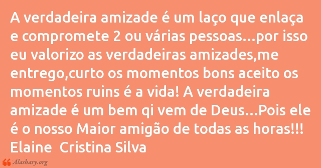 A verdadeira amizade é um laço que enlaça e compromete 2 ou várias pessoas...por isso eu valorizo as verdadeiras amizades,me entrego,curto os momentos bons aceito os momentos ruins é a vida! A verdadeira amizade é um bem qi vem de Deus...Pois ele é o nosso Maior amigão de todas as horas!!!