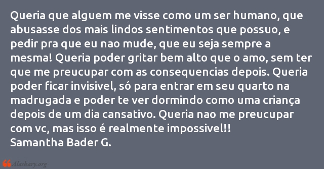 Queria que alguem me visse como um ser humano, que abusasse dos mais lindos sentimentos que possuo, e pedir pra que eu nao mude, que eu seja sempre a mesma! Queria poder gritar bem alto que o amo, sem ter que me preucupar com as consequencias depois. Queria poder ficar invisivel, só para entrar em seu quarto na madrugada e poder te ver dormindo como uma criança depois de um dia cansativo. Queria nao me preucupar com vc, mas isso é realmente impossivel!!