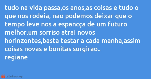 tudo na vida passa,os anos,as coisas e tudo o que nos rodeia, nao podemos deixar que o tempo leve nos a espancça de um futuro melhor,um sorriso atrai novos horinzontes,basta testar a cada manha,assim coisas novas e bonitas surgirao..