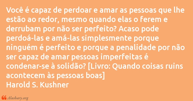 Você é capaz de perdoar e amar as pessoas que lhe estão ao redor, mesmo quando elas o ferem e derrubam por não ser perfeito? Acaso pode perdoá-las e amá-las simplesmente porque ninguém é perfeito e porque a penalidade por não ser capaz de amar pessoas imperfeitas é condenar-se à solidão? [Livro: Quando coisas ruins acontecem às pessoas boas]