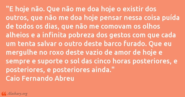 "E hoje não. Que não me doa hoje o existir dos outros, que não me doa hoje pensar nessa coisa puída de todos os dias, que não me comovam os olhos alheios e a infinita pobreza dos gestos com que cada um tenta salvar o outro deste barco furado. Que eu mergulhe no roxo deste vazio de amor de hoje e sempre e suporte o sol das cinco horas posteriores, e posteriores, e posteriores ainda."