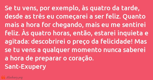 Se tu vens, por exemplo, às quatro da tarde, desde as três eu começarei a ser feliz. Quanto mais a hora for chegando, mais eu me sentirei feliz. Às quatro horas, então, estarei inquieta e agitada: descobrirei o preço da felicidade! Mas se tu vens a qualquer momento nunca saberei a hora de preparar o coração.