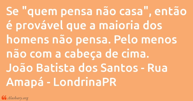 Se "quem pensa não casa", então é provável que a maioria dos homens não pensa. Pelo menos não com a cabeça de cima. João Batista dos Santos - Rua Amapá - LondrinaPR