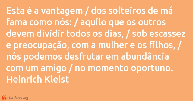 Esta é a vantagem / dos solteiros de má fama como nós: / aquilo que os outros devem dividir todos os dias, / sob escassez e preocupação, com a mulher e os filhos, / nós podemos desfrutar em abundância com um amigo / no momento oportuno.