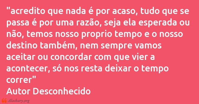 "acredito que nada é por acaso, tudo que se passa é por uma razão, seja ela esperada ou não, temos nosso proprio tempo e o nosso destino também, nem sempre vamos aceitar ou concordar com que vier a acontecer, só nos resta deixar o tempo correr"
