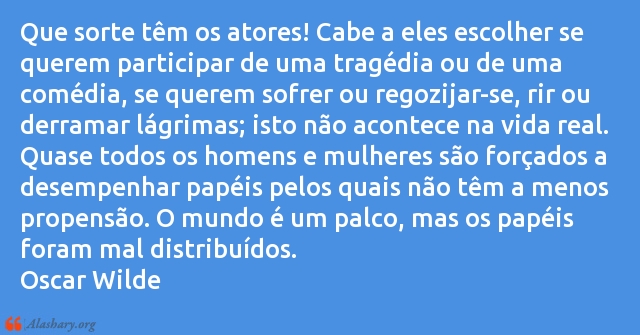 Que sorte têm os atores! Cabe a eles escolher se querem participar de uma tragédia ou de uma comédia, se querem sofrer ou regozijar-se, rir ou derramar lágrimas; isto não acontece na vida real. Quase todos os homens e mulheres são forçados a desempenhar papéis pelos quais não têm a menos propensão. O mundo é um palco, mas os papéis foram mal distribuídos.