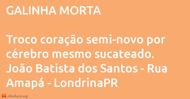GALINHA MORTA Troco coração semi-novo por cérebro mesmo sucateado. João Batista dos Santos - Rua Amapá - LondrinaPR