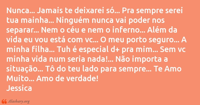 Nunca... Jamais te deixarei só... Pra sempre serei tua mainha... Ninguém nunca vai poder nos separar... Nem o céu e nem o inferno... Além da vida eu vou está com vc... O meu porto seguro... A minha filha... Tuh é especial d+ pra mim... Sem vc minha vida num seria nada!... Não importa a situação... Tô do teu lado para sempre... Te Amo Muito... Amo de verdade!