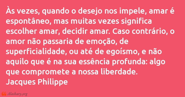 Às vezes, quando o desejo nos impele, amar é espontâneo, mas muitas vezes significa escolher amar, decidir amar. Caso contrário, o amor não passaria de emoção, de superficialidade, ou até de egoísmo, e não aquilo que é na sua essência profunda: algo que compromete a nossa liberdade.