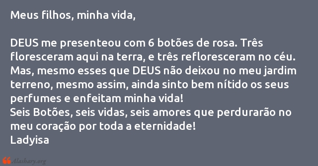 DEUS me presenteou com 6 botões de rosa. Três floresceram aqui na terra, e três refloresceram no céu. Mas, mesmo esses que DEUS não deixou no meu jardim terreno, mesmo assim, ainda sinto bem nítido os seus perfumes e enfeitam minha vida!