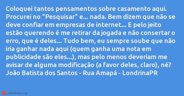 Coloquei tantos pensamentos sobre casamento aqui. Procurei no "Pesquisar" e... nada. Bem dizem que não se deve confiar em empresas de internet... E pelo jeito estão querendo é me retirar da jogada e não consertar o erro, que é deles... Tudo bem, eu sempre soube que não iria ganhar nada aqui (quem ganha uma nota em publicidade são eles...), mas pelo menos deveriam me avisar de alguma modificação (a favor deles, claro), né?