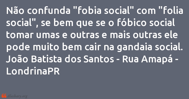 Não confunda "fobia social" com "folia social", se bem que se o fóbico social tomar umas e outras e mais outras ele pode muito bem cair na gandaia social. João Batista dos Santos - Rua Amapá - LondrinaPR