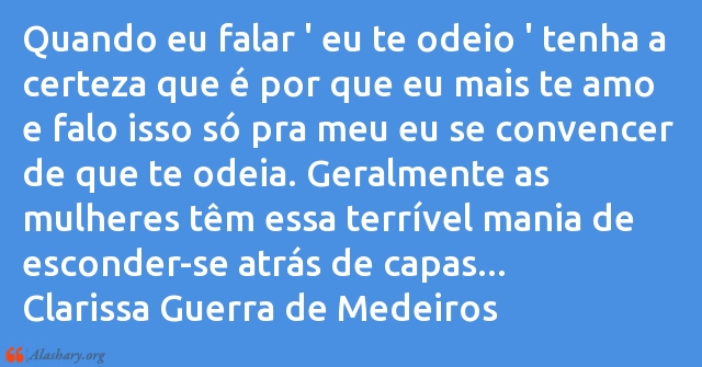 Quando eu falar ' eu te odeio ' tenha a certeza que é por que eu mais te amo e falo isso só pra meu eu se convencer de que te odeia. Geralmente as mulheres têm essa terrível mania de esconder-se atrás de capas... Clarissa Guerra de Medeiros