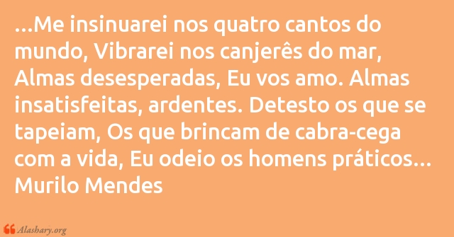 ...Me insinuarei nos quatro cantos do mundo, Vibrarei nos canjerês do mar, Almas desesperadas, Eu vos amo. Almas insatisfeitas, ardentes. Detesto os que se tapeiam, Os que brincam de cabra-cega com a vida, Eu odeio os homens práticos...