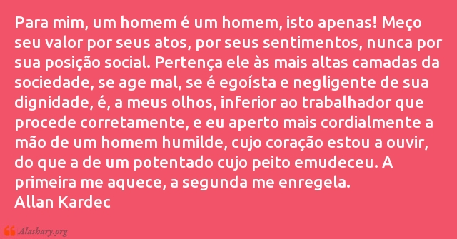 Para mim, um homem é um homem, isto apenas! Meço seu valor por seus atos, por seus sentimentos, nunca por sua posição social. Pertença ele às mais altas camadas da sociedade, se age mal, se é egoísta e negligente de sua dignidade, é, a meus olhos, inferior ao trabalhador que procede corretamente, e eu aperto mais cordialmente a mão de um homem humilde, cujo coração estou a ouvir, do que a de um potentado cujo peito emudeceu. A primeira me aquece, a segunda me enregela.