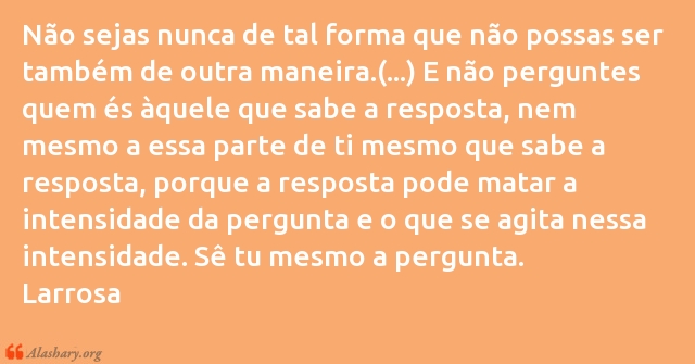 Não sejas nunca de tal forma que não possas ser também de outra maneira.(...) E não perguntes quem és àquele que sabe a resposta, nem mesmo a essa parte de ti mesmo que sabe a resposta, porque a resposta pode matar a intensidade da pergunta e o que se agita nessa intensidade. Sê tu mesmo a pergunta.