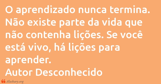 O aprendizado nunca termina. Não existe parte da vida que não contenha lições. Se você está vivo, há lições para aprender. Autor Desconhecido