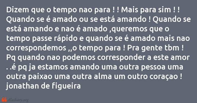 Dizem que o tempo nao para ! ! Mais para sim ! ! Quando se é amado ou se está amando ! Quando se está amando e nao é amado ,queremos que o tempo passe rápido e quando se é amado mais nao correspondemos ,,o tempo para ! Pra gente tbm ! Pq quando nao podemos corresponder a este amor . .é pq ja estamos amando uma outra pessoa uma outra paixao uma outra alma um outro coraçao !