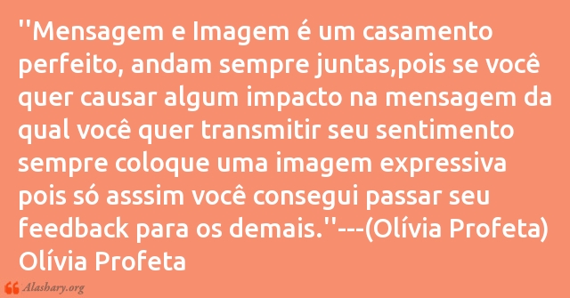 ''Mensagem e Imagem é um casamento perfeito, andam sempre juntas,pois se você quer causar algum impacto na mensagem da qual você quer transmitir seu sentimento sempre coloque uma imagem expressiva pois só asssim você consegui passar seu feedback para os demais.''---(Olívia Profeta)