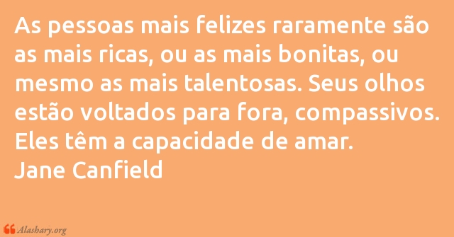 As pessoas mais felizes raramente são as mais ricas, ou as mais bonitas, ou mesmo as mais talentosas. Seus olhos estão voltados para fora, compassivos. Eles têm a capacidade de amar. Jane Canfield