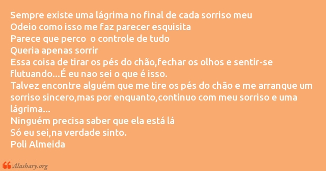Talvez encontre alguém que me tire os pés do chão e me arranque um sorriso sincero,mas por enquanto,continuo com meu sorriso e uma lágrima...