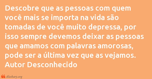 Descobre que as pessoas com quem você mais se importa na vida são tomadas de você muito depressa, por isso sempre devemos deixar as pessoas que amamos com palavras amorosas, pode ser a última vez que as vejamos. Autor Desconhecido