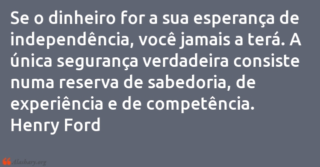 Se o dinheiro for a sua esperança de independência, você jamais a terá. A única segurança verdadeira consiste numa reserva de sabedoria, de experiência e de competência. Henry Ford