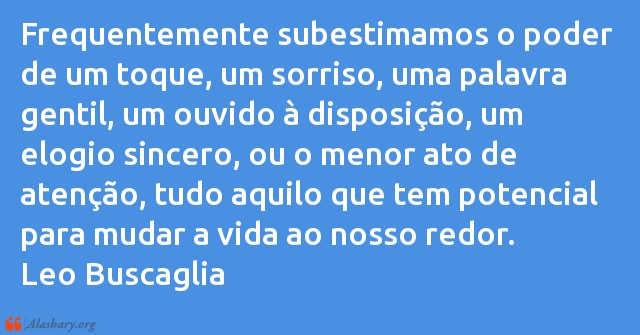 Frequentemente subestimamos o poder de um toque, um sorriso, uma palavra gentil, um ouvido à disposição, um elogio sincero, ou o menor ato de atenção, tudo aquilo que tem potencial para mudar a vida ao nosso redor. Leo Buscaglia